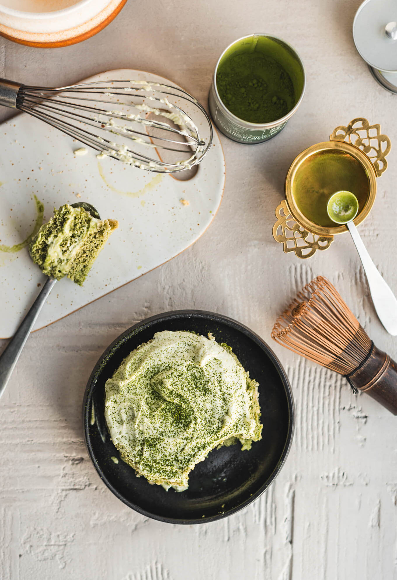 Pirma pasiruošiam ☝️geros kokybės matchą (su vandeniu💦) ir paliekam pravėsti (kadangi jos nekepsim, tikrai nenaudokit kulinarinių pakaitalų – išbandyta ir neskanu).