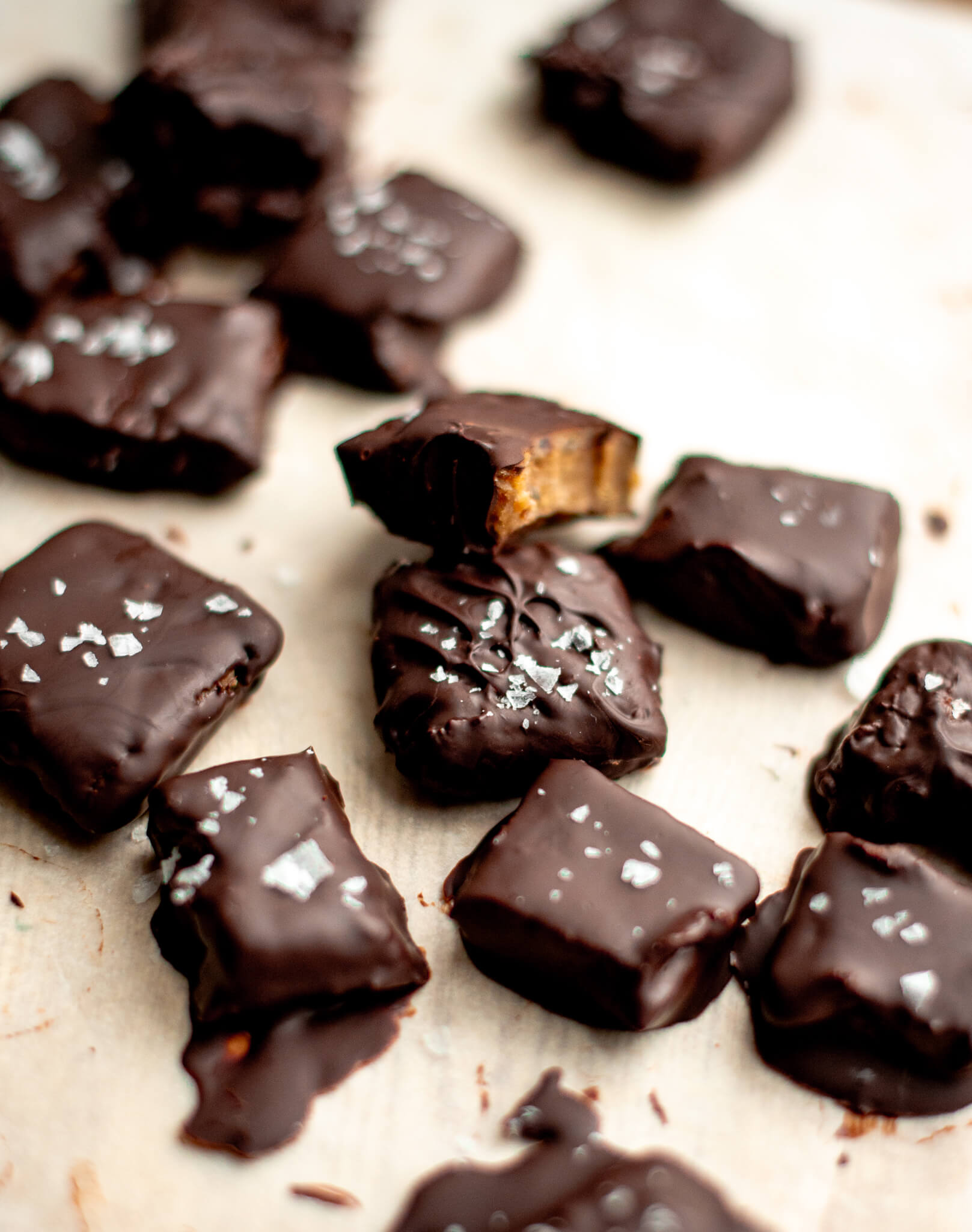 Dedame į šaldytuvą keliom valandom arba į šaldymo kamerą (galima ir trumpiau -pakaks pusvalanduko). Supjaustom kvadrateliais, kuriuos mirkome tirpintame šokolade. Dedam vėl į šaldytuvą, kol šokoladas sustings :) Galima apiberti šiek tiek druskos dripsniais, tada į pačią „tešlą” gali nedėt druskos.