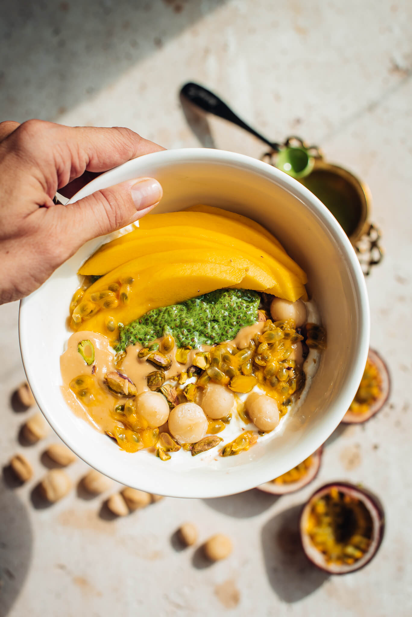 Į dubenėlį dedam jogurtą, pasiflorą, mango, makadamijas, pistacijas ar kitus riešutus. Paskaninam riešutų kremu🤩