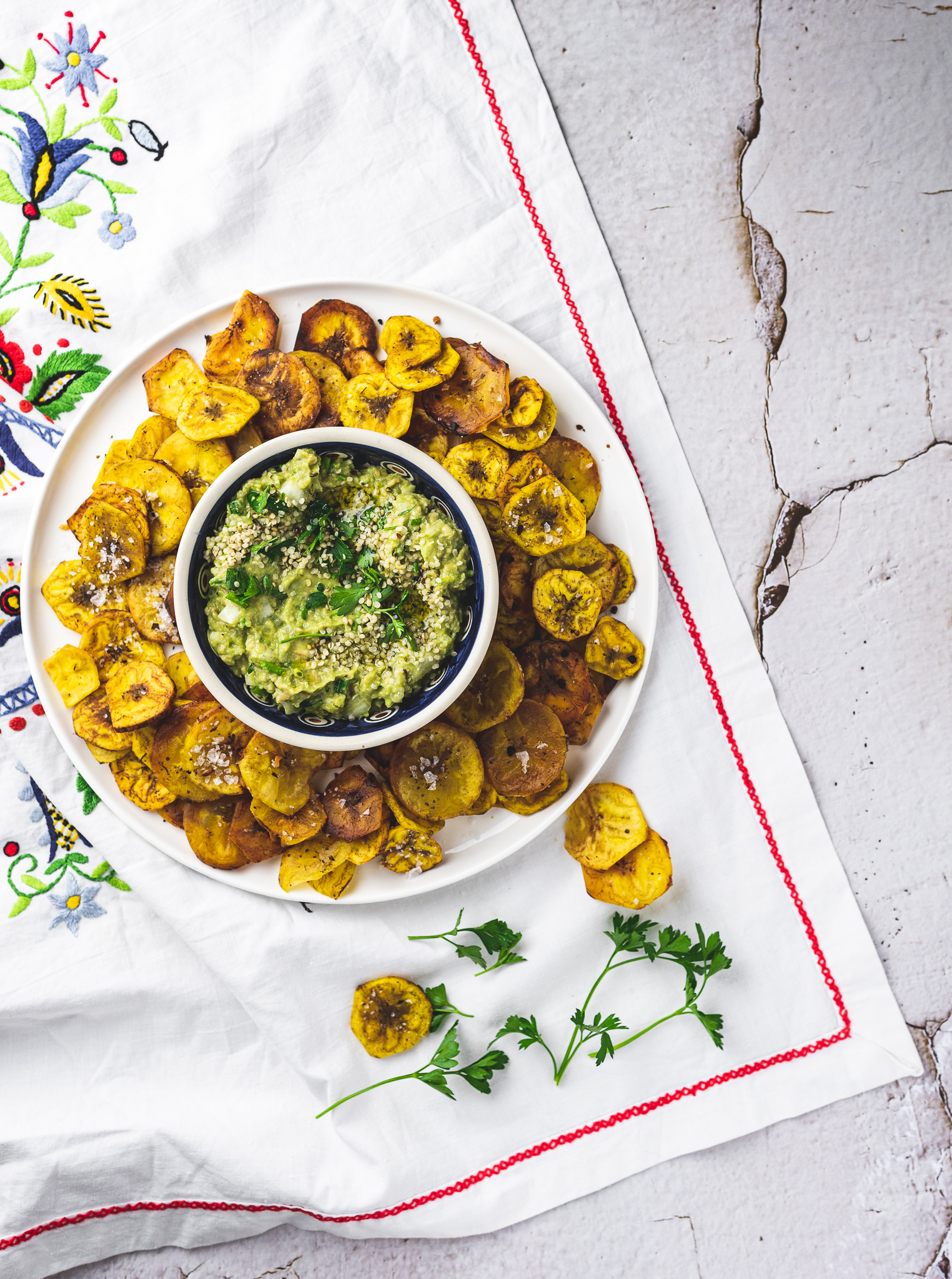 Be to, neseniai praūžęs Día de Muertos įkvėpė pasigaminti kažką kvepiančio Meksika. Nors kiek žinau, plantainių taip nepateikia Mexikoje, užtat gvakamolę – dar ir kaip. Tik aš gvakamolę gaminu savaip – be pomidorų ir su ančiuviais. Bet drąsiai grįžkite prie originalo, kurį sudaro avokadas, pomidorai, raudonasis svogūnas.
