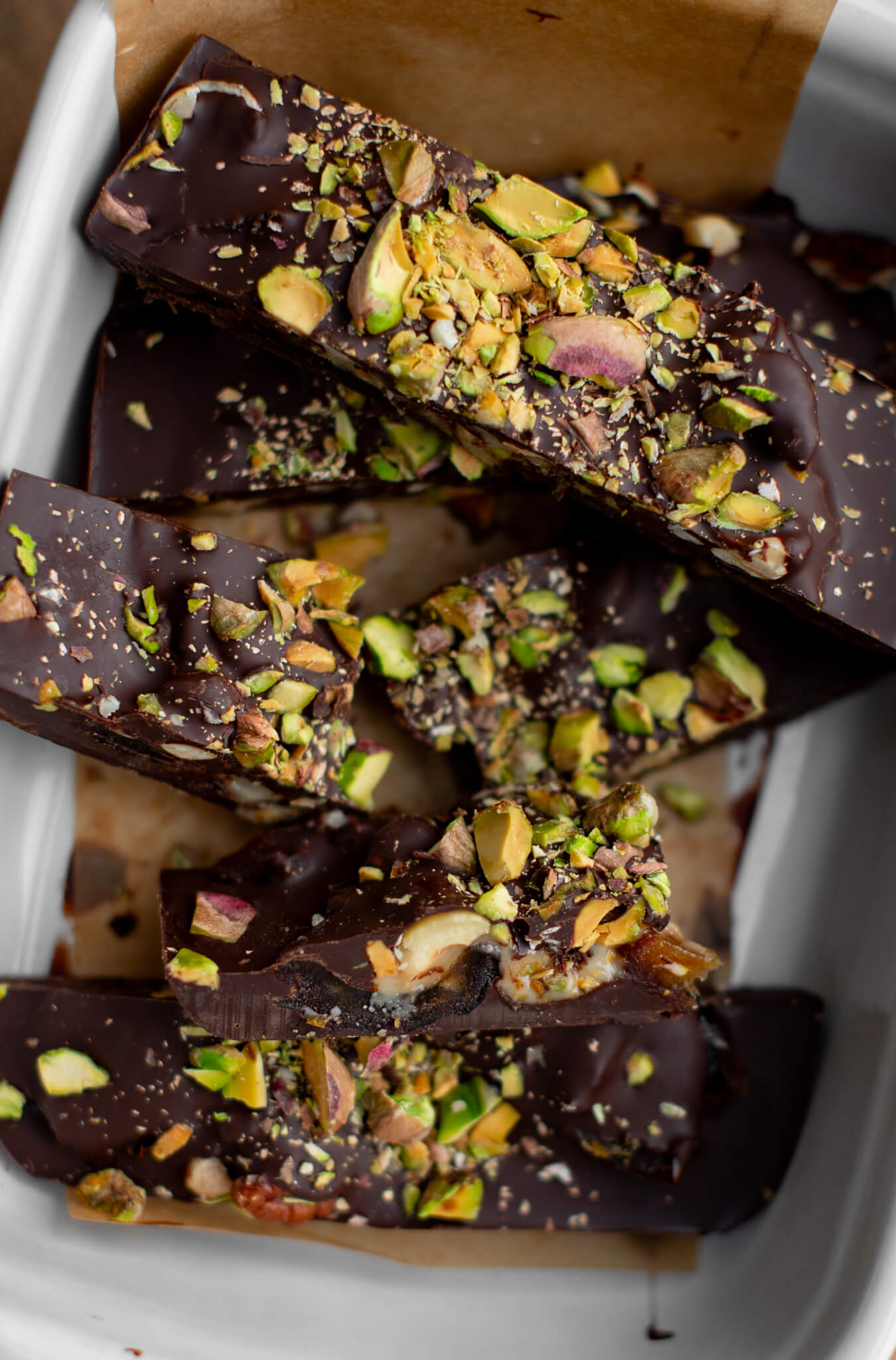 Šįkart, bičiuliai, atleiskite, bet nebus konkrečių gramatūrų, nes viską dariau „iš akies”. Naudoju 80 % juodą šokoladą, Medjol datules, naminį lazdynų riešutų kremą (sublenderiuoju skrudintus lazdynus), įvairius skrudintus smulkintus riešutus. Galima papildomai pabarstyti druska. Po kelių valandų šaldytuve desertą pjaustom ir skanaujam. Beje, mano instagrame rasi gana detalų receptą ir reels formatu.